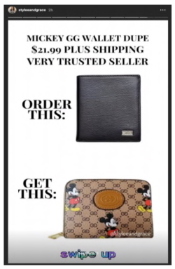 A feature of the activity was a so-called “Order this/Get this” ploy. The listings promoted using social media might be for a generic wallet style, for example – making them hard to detect. However, tipped off purchasers would be aware that they would in fact receive a knock-off, as the image below illustrates.