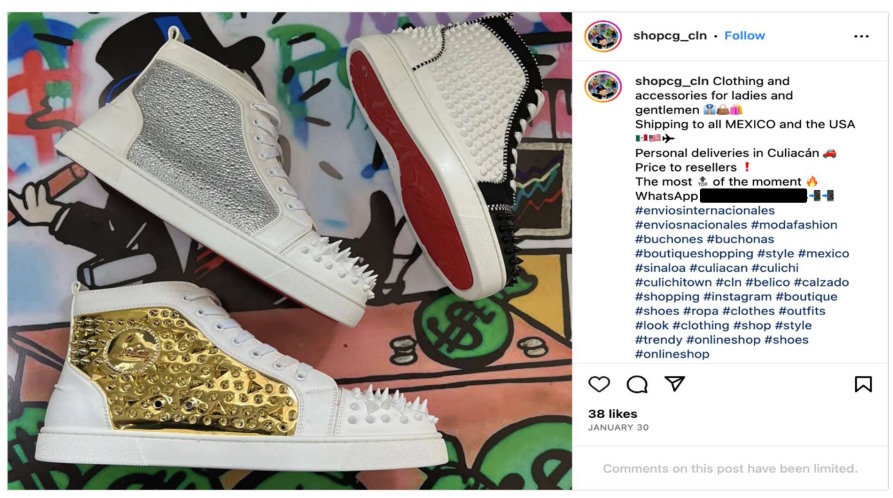 The defendant – identified in court documents as Cesar Octavio Guerrero Alejo of Culiacán, Sinaloa – is accused of using digital platforms, including Facebook and Instagram, to promote the sale of counterfeits, including Christian Louboutin-branded shoes, handbags, and accessories.