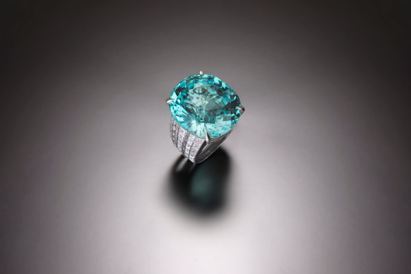 The handmade platinum ring – which features a 49,88ct natural oval-cut Paraiba Tourmaline and 60 baguette-cut diamonds and is worth an estimated £140,000-£180,000 ($160,000-$205,000) – is due to be auctioned on November 9.