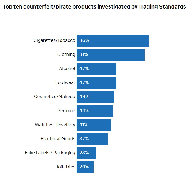 86 per cent of Trading Standards authorities who participated in the latest IPO survey said they had investigated cigarettes/tobacco cases, followed by clothing (81 per cent) and alcohol and footwear – both at 47 per cent in the last financial year.