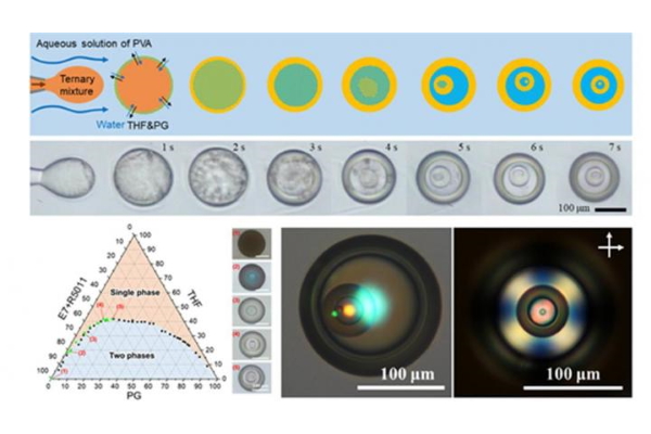 Depending on the initial mixing ratio of the substances, they separated into multiple layers ranging from one to five, and these layers could be freely controlled. Also, with the phase separation occurring continually within each emulsion drop, the concentration of the chiral dopant inside the liquid crystals changed, resulting in multiple structural colors. This is a new technology to fabricate liquid crystals of multiple layers through a simple process of emulsifying the mixture that has never before been reported.